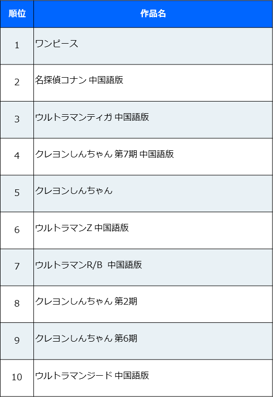 1月中旬から中国本土では学生ユーザーが冬休みに入り、「ウルトラマン」シリーズと「クレヨンしんちゃん」シリーズの人気が上昇し、多くの作品がトップ10にランクインした。2月も同じトレンドが続くと予測される。「ドラゴンボール」はその影響でトップ10から姿を消した。