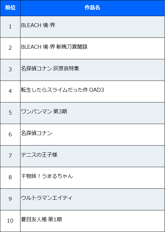 1月には「干物妹!うまるちゃん」が新たにトップ10入りし、「ウルトラマンエイティ」がトップ10に復帰した。以前と同様、Youkuでは「BLEACH」シリーズの人気が高かった。