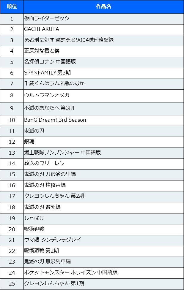 2026年冬アニメの新作として「勇者刑に処す 懲罰勇者9004隊刑務記録」と「正反対な君と僕」がトップ10に初ランクインし、「仮面ライダーゼッツ」は1位を記録した。2026年1月末時点でのBilibiliで配信スタートした日本の2026年冬アニメ新作は上記の2作のみで、通常より大幅に減少している。