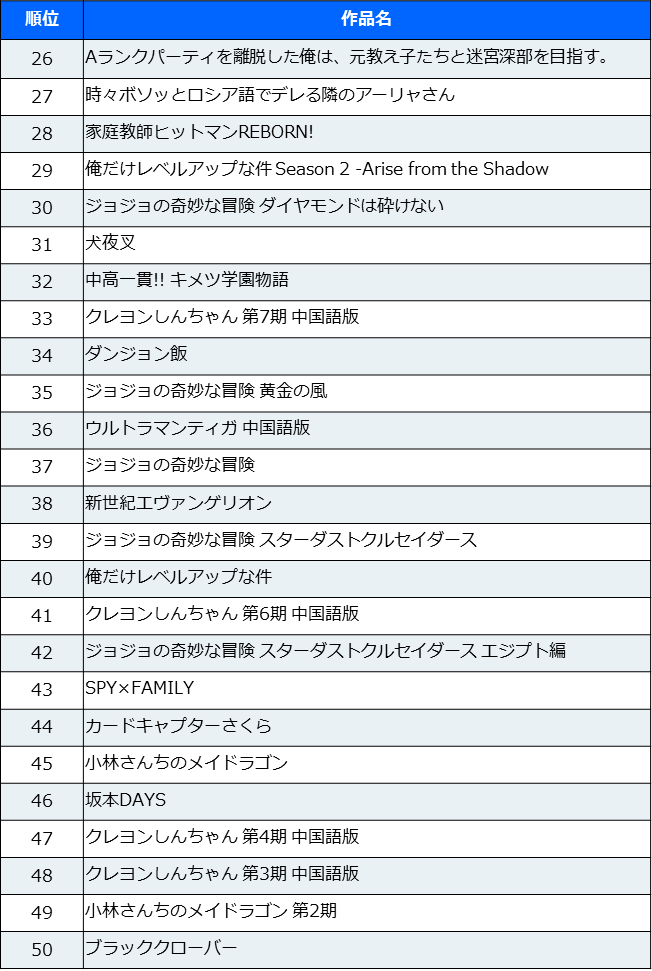 日本と同時期に配信をスタートした新作が非常に少なかったため、ランキング後半はほとんど過去の作品が占めていた。