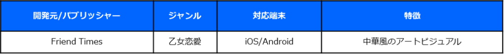 中国女性向けゲームの開発に注力している企業であるFriendTimesが新しく発表した作品。男性キャラクターを攻略し、恋愛関係を築く乙女ゲームの基本プレイモードに加え、本作ではマイホームのカスタマイズやヒロインの着せ替えができるプレイモードも導入。ハイクオリティの男性キャラクターのイラストは現地女性プレイヤーの注目を集めている。