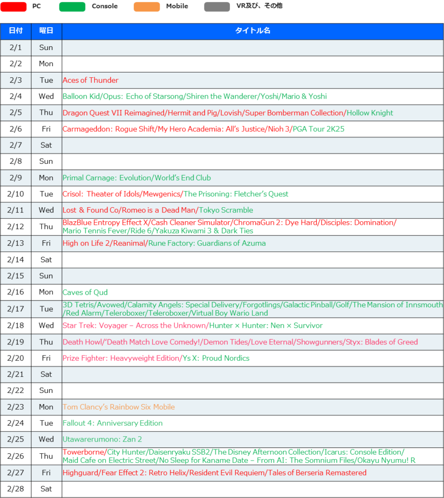 【2026年2月】新作リリースカレンダー