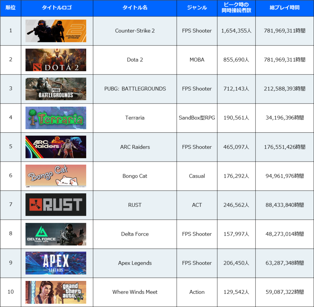 サバイバルゲーム「RUST」が7位に復帰、「Counter-Strike 2」が先月と同様に1位をキープした。
