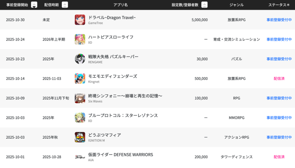 2025年10月の事前登録開始タイトルは8タイトル。そのうち2タイトルが配信済み。