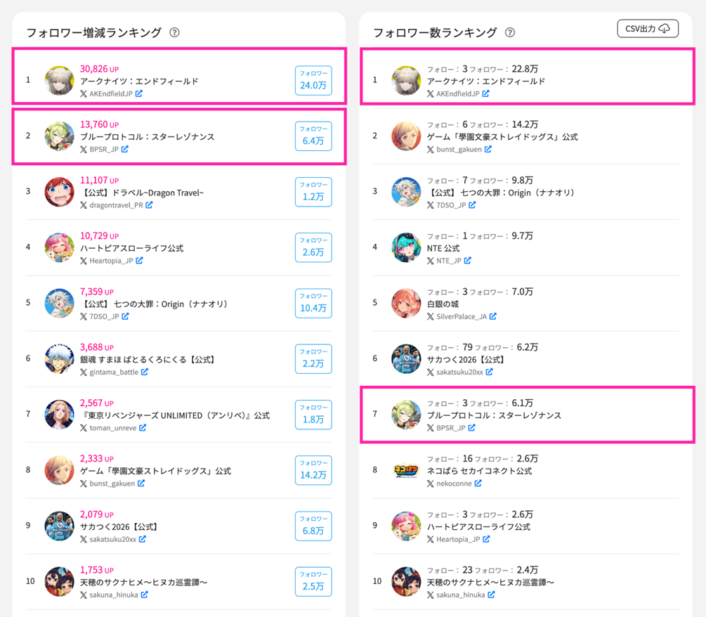 フォロワー増減ランキング1位の『アークナイツ:エンドフィールド』公式は、10/31に第2回βテストの参加者募集を開始して以降、フォロワー数がうなぎ上りに増加。1ヶ月で3万人以上増加し、現在のフォロワー数は22.8万人となっている。βテスト参加資格やAmazonギフトカードがもらえるフォロー&リポストキャンペーンの開催に加え、オペレーター紹介ポストの毎日投稿がフォロワー数の大幅増加につながったといえるだろう。第2回βテストは11/28より開始され、終了日時は未定。年末のコミックマーケットへの出展も発表され、さらなるフォロワー数の増加が予想される。
