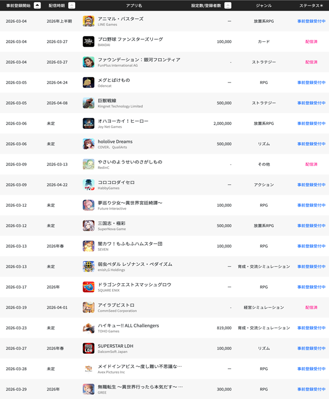 2026年3月の事前登録開始タイトルは19タイトル。そのうち4タイトルが配信済み。