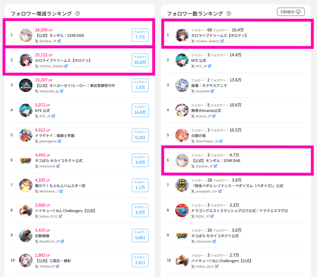 増減ランキング2位となったのは『ホロライブドリーム』公式X。事前登録受付を開始して2日間でフォロワー数が1.5万人増加した。事前登録キャンペーン施策のひとつとして、公式Xをフォロー&ハッシュタグをつけて事前登録画面を投稿で、抽選で100名に公式トレーディングカードゲームのカード、全15種セットが当たるキャンペーンを開催。最新のフォロワー数は16.8万となっている。
