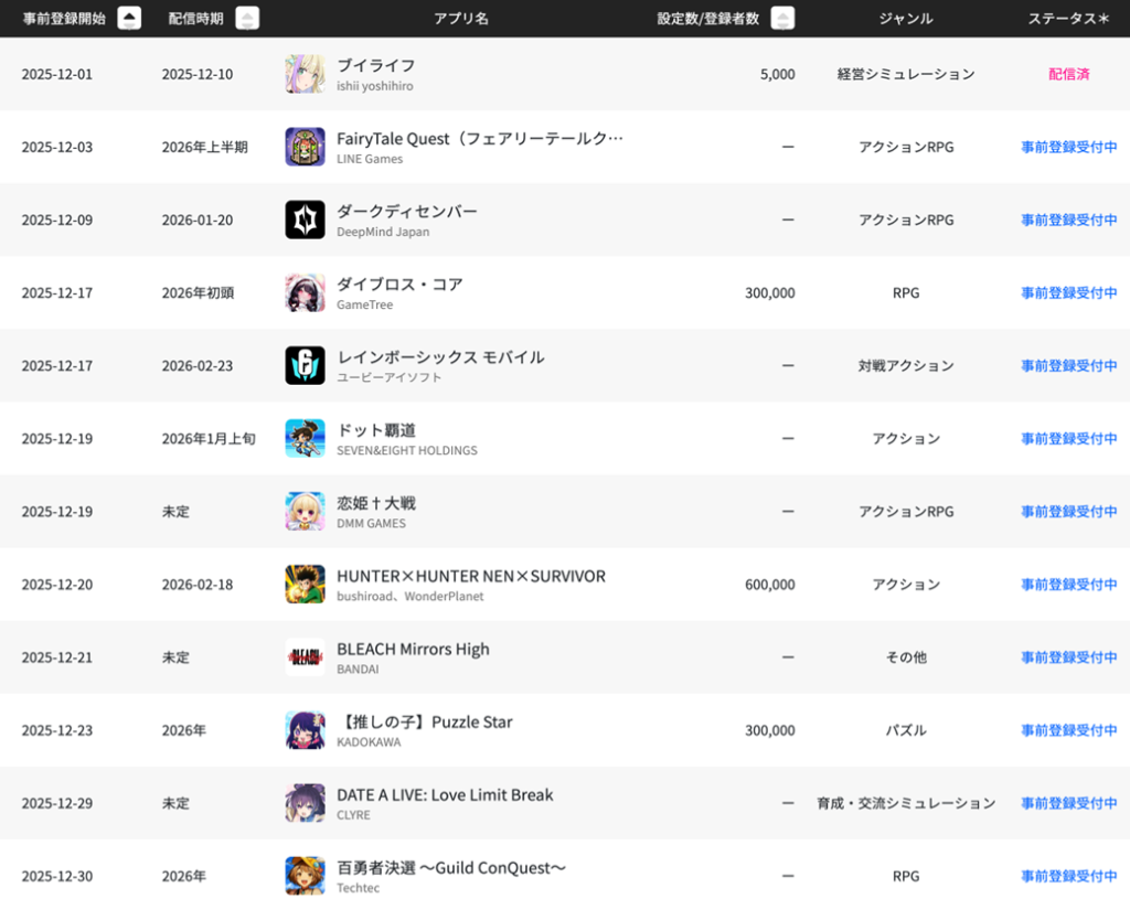 2025年12月の事前登録開始タイトルは12タイトル。そのうち1タイトルが配信済み。
