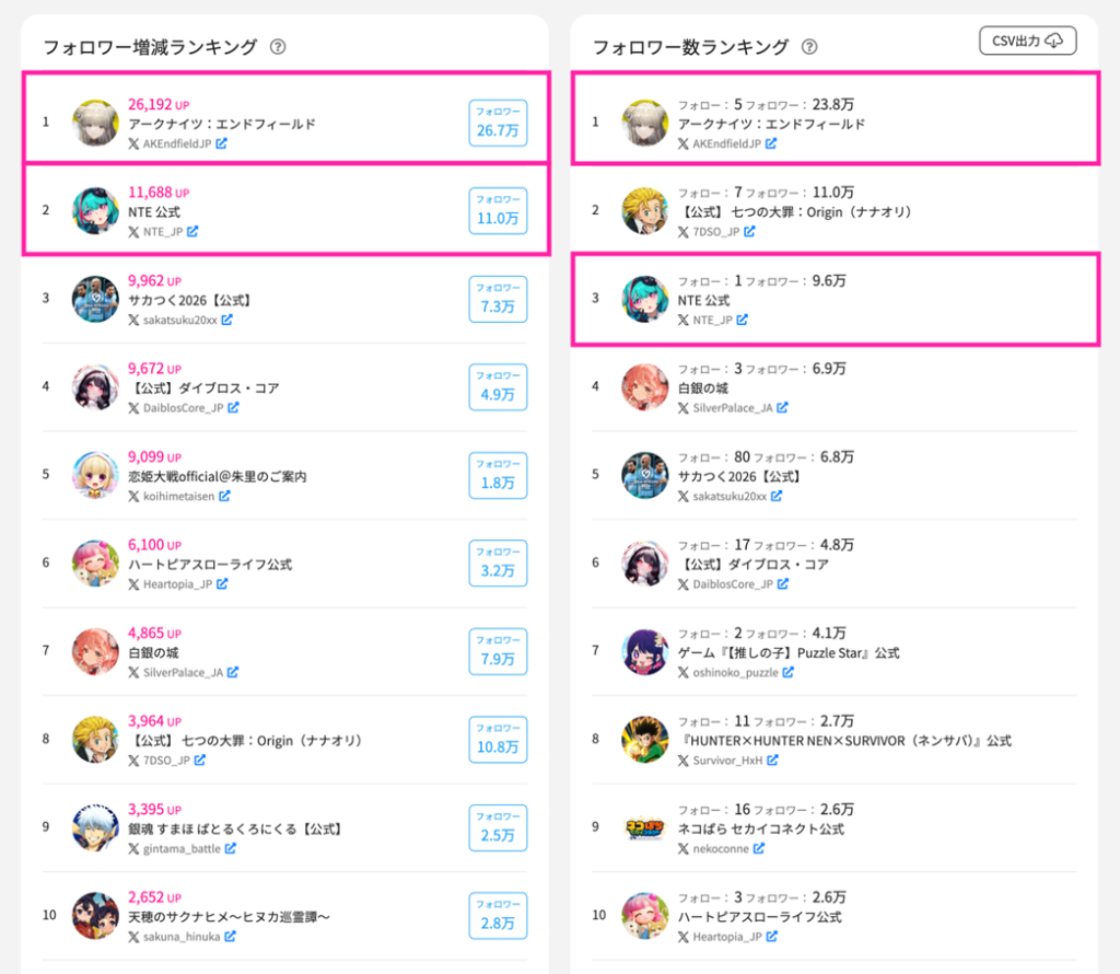 1/22に正式リリースを控える『アークナイツ:エンドフィールド』公式は、先月に続いて2ヶ月連続でフォロワー増減ランキング1位に。12/12に投稿されたリリース日発表ポストは3.1万いいね、1.5万リポストを記録した。1ヶ月のうちで最も反響があったポストはリリース日決定を記念して行われたキャンペーン用ポストで、フォロー&リポストで「iPhone 17 Pro」や「PlayStation 5 Pro」がもらえるという投稿が2.7万リポストを集め、フォロワー数は1日で約5,000人増加した。