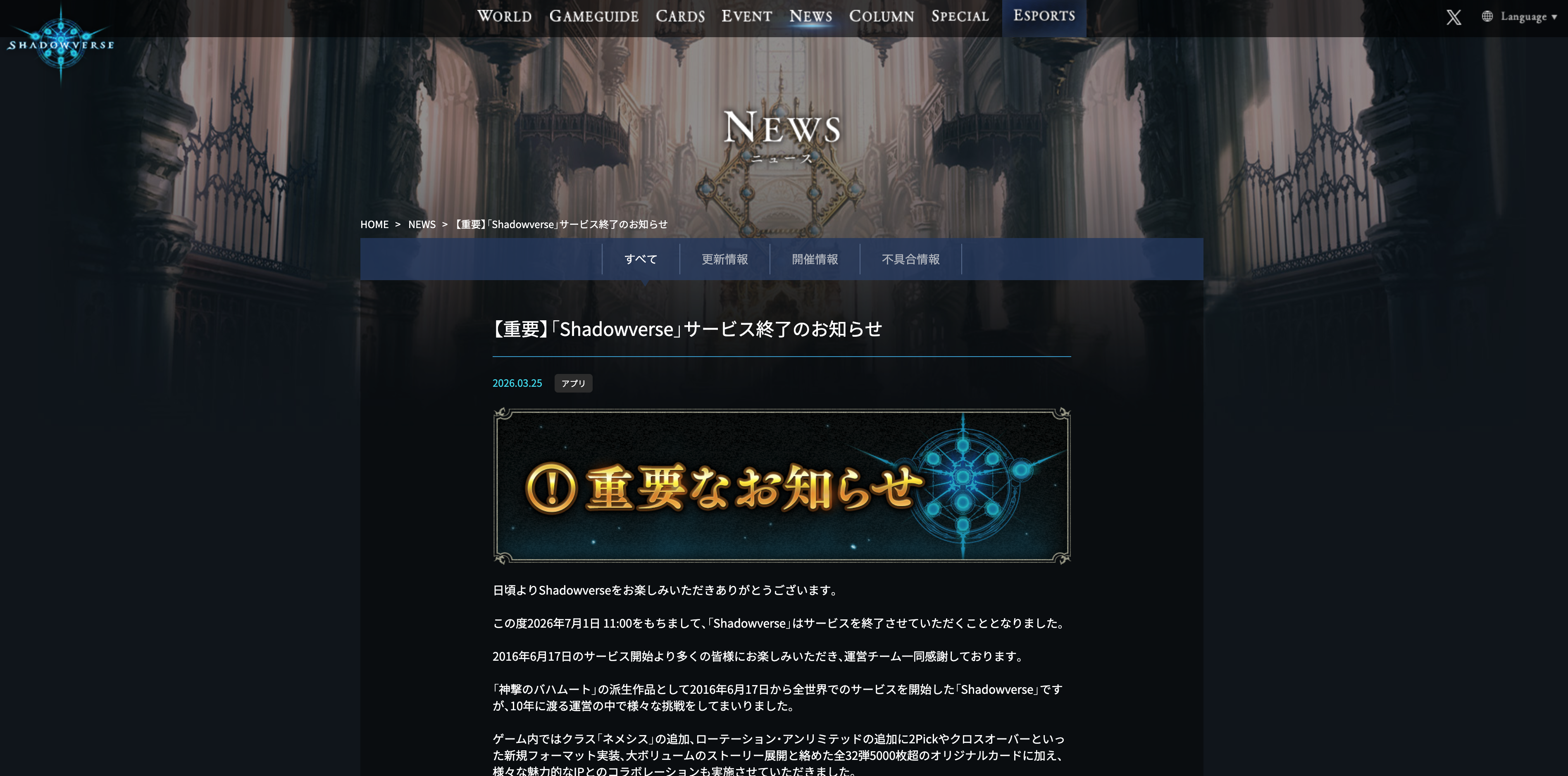Cygamesは2026年3月25日、対戦型オンラインTCG『Shadowverse』について、2026年7月1日11:00をもってサービスを終了すると発表した。